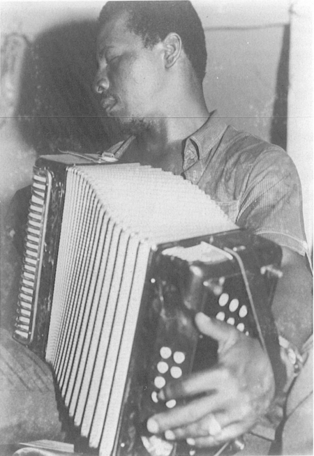 Reynoir "Négoce" Casimir à Jabrun (Baie-Mahault), orchestre de quadrille "Négoce et Danican", photographié par Christian Dahomay (extrait de "Alors, ma chère. Carnot par lui-même. Propos d'un musicien guadeloupéen", Marie-Céline Lafontaine, Editions Caribéennes, 1986).