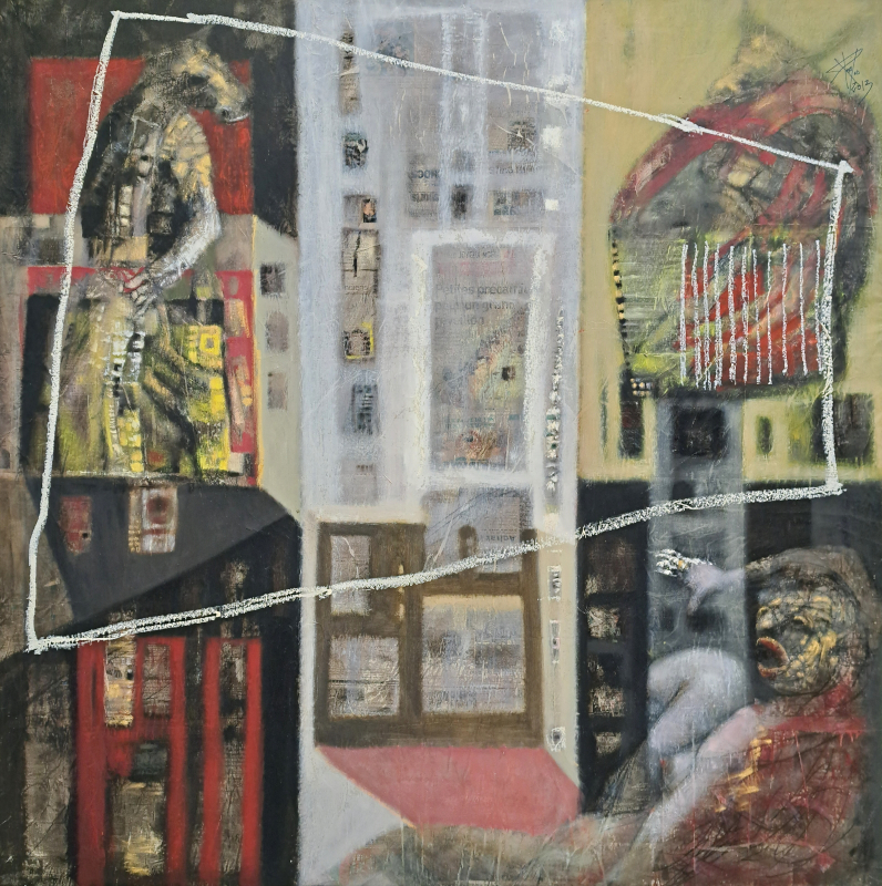 "Mythologies créoles" par Michel Rovélas, acrylique sur toile, 200 x 200 cm, 2013, collection du Fonds d'Art Contemporain (Conseil Départemental de la Guadeloupe).