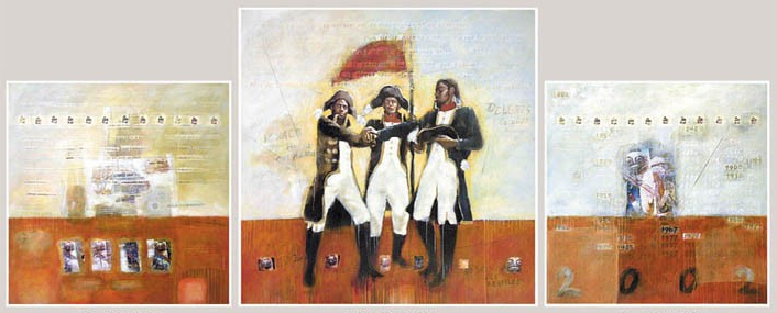 "Le Serment des Rebelles" par Richard-Viktor Sainsily Cayol, technique mixte sur toile, 150 x 150 cm, 200 x 200 cm, 150 x 150 cm, 2002, collection du Fonds d'Art Contemporain (Conseil Départemental de la Guadeloupe). Triptyque réalisé dans le cadre des commémorations du bicentenaire 1802 - 2002, sur une commande du Conseil départemental de la Guadeloupe.